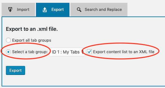 To export a tab group to an XML file, in your WordPress backend, goto left menu Wonder Tabs -> Import/Export. In the Export tab, choose the option "Select a tab group", select a tab group, check the option "Export content list to an XML file", then click the button "Export".