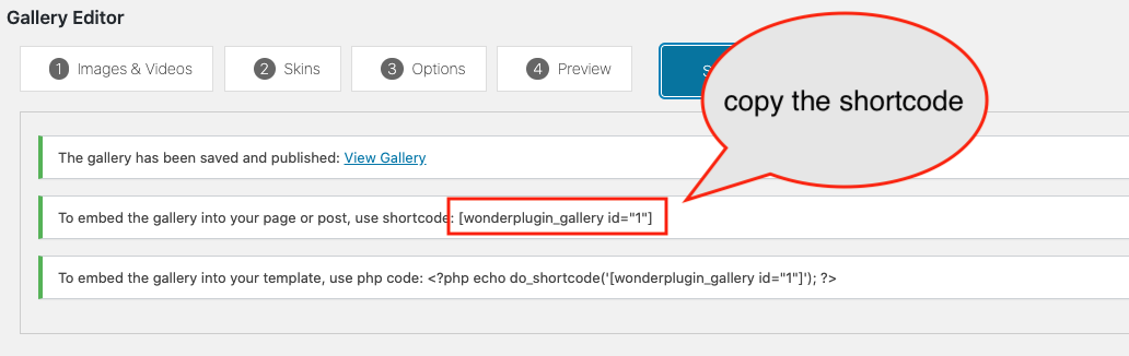 • Step 5 - Publish the WordPress gallery and add the gallery shortcode to the WordPress post or page