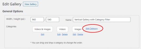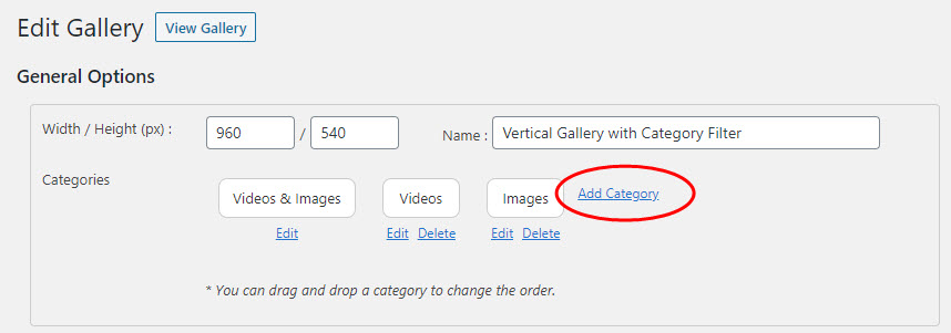 In the plugin Wonder Gallery, create a new gallery or edit an existing gallery. In the General Options section, click the link 'Add Category'.