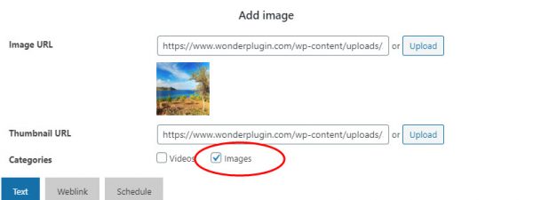In the plugin editor, step 1 > Images & Videos tab, add an image or video, the categories you added in the above step will be listed in the Add Image or Add Video dialog.