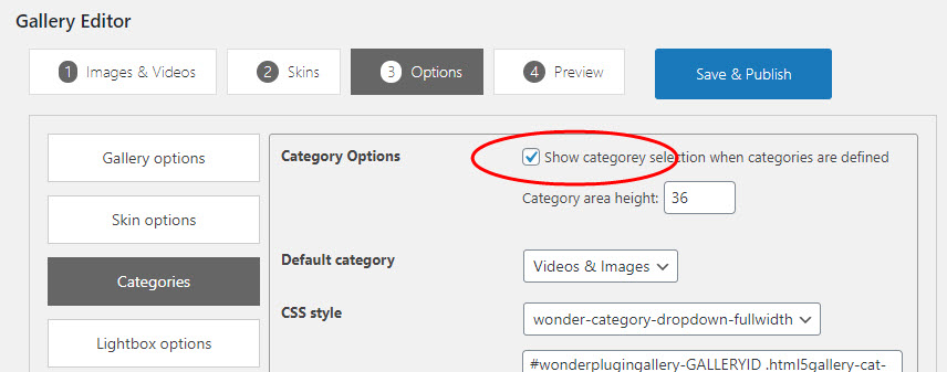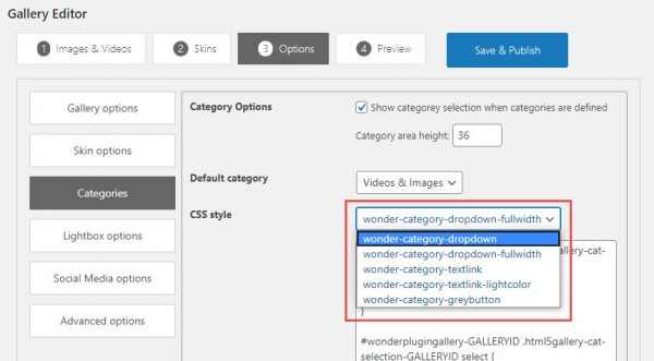 In the CSS style dropdown list, you can choose to display the category filter as buttons, textlink or dropdown selection.