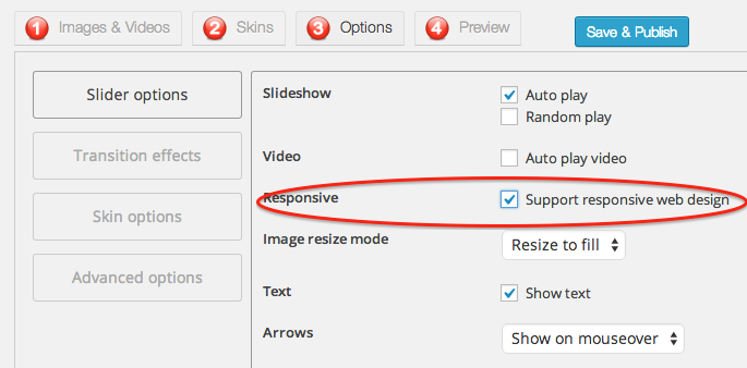 In the Gallery/Slider editor, step 3, Options tab, there is an option Support responsive web design, please check it.