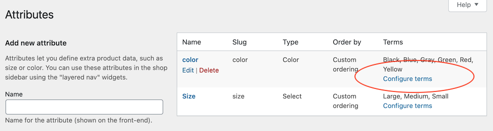 3. Go back to the Attributes page, then click Configure terms of the attribute.