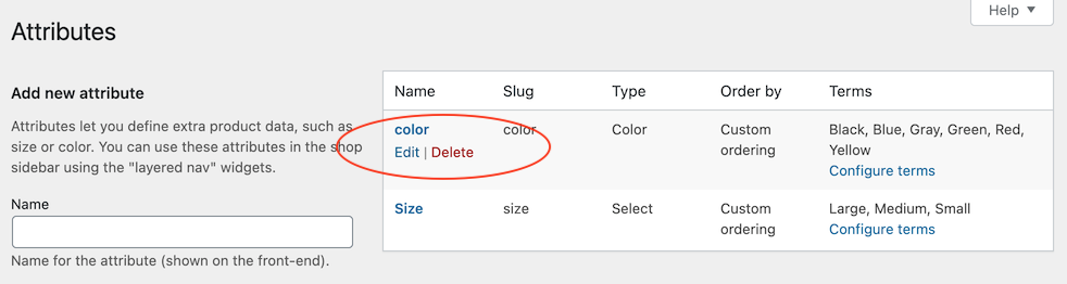 1. In your WordPress dashboard, go to the left menu Products -> Attributes, hover the mouse over the attribute title, then click the Edit link.