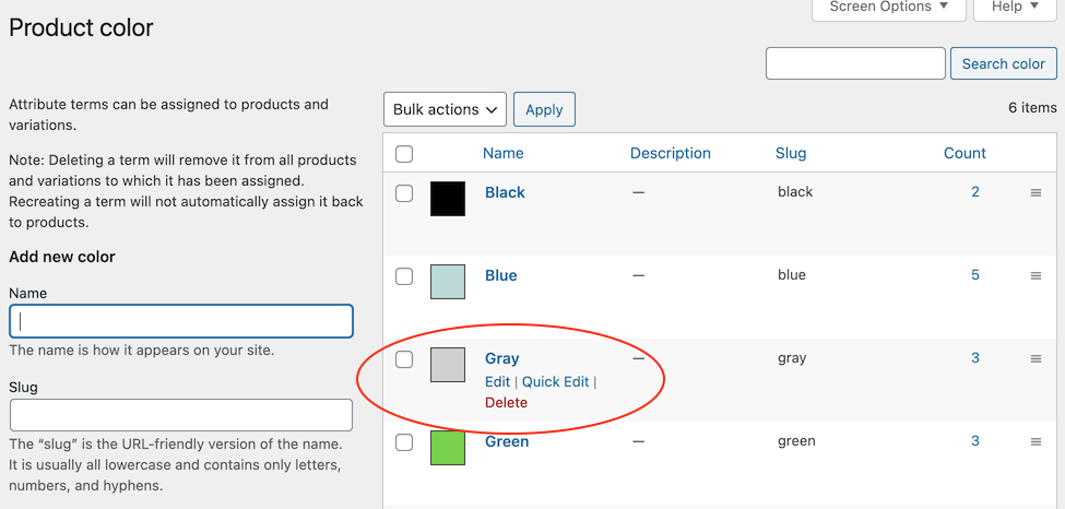 4. If you have configured the attribute type as Color, you can edit the term and select a color.