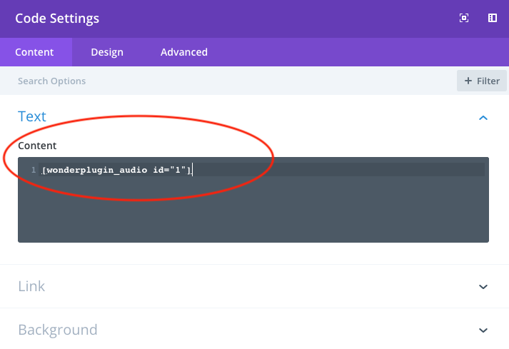 In the Code Settings dialog, add the audio player shortcode to the Content input box.