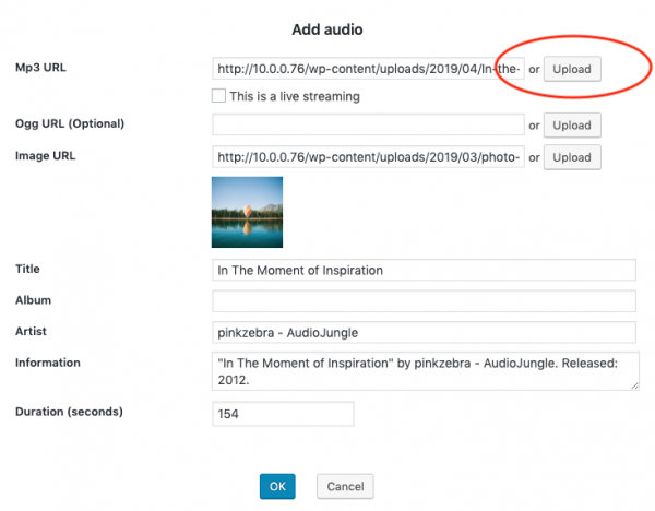 In the plugin, step 1, click the Add Audio button, in the Add Audio dialog, select or upload an mp3 file from Media Library. You can also select a cover image for the audio and enter title, album and artist information.