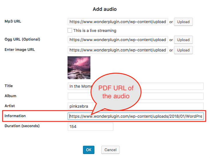 In the plugin, step 1, edit the audio file, enter the PDF URL to the Information input box.
