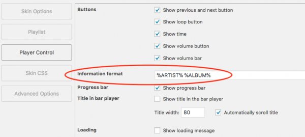 In the plugin, step 3 Options tab, Player Control, change the value of the input box "Information format" to the follows: