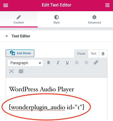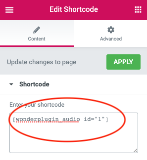 To add the audio player to Elementor, in Elementor editor, add a Shortcode element, then enter the shortcode.
