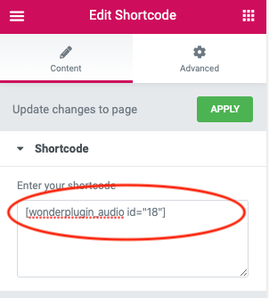 Copy the audio player shortcode and paste it to the Shortcode element.