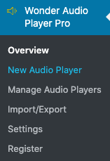 Step 1 - After you install the plugin, in your WordPress backend, go to the left menu, Wonder Audio Player > New Audio Player and create a new WordPress audio player.