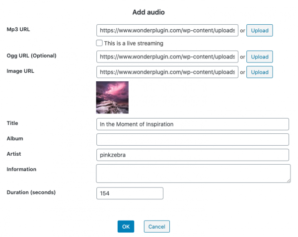 Step 2 - In the Audio Player Editor, step 1 Mp3 tab, click the Add Audio tab. You can upload an mp3 file to WordPress Media Library, or directly enter your mp3 URL.
