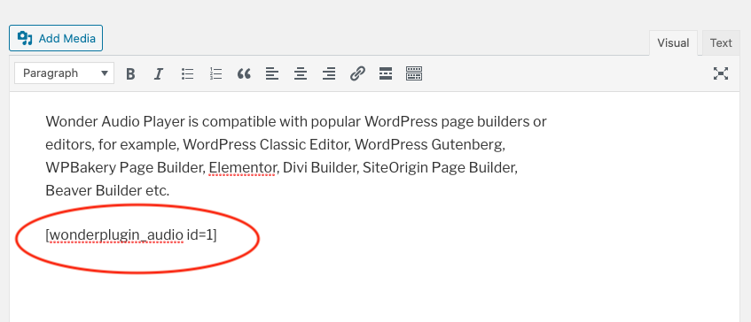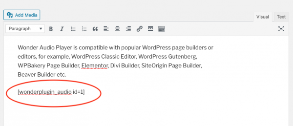 If you are using a WordPress page builder or editor, you can view the the page Wonder Audio Player Help for how to add the WordPress audio player to popular WordPress page builders or editors, for example, WordPress Gutenberg, WPBakery Page Builder, Elementor, Divi Builder, SiteOrigin Page Builder and Beaver Builder etc.