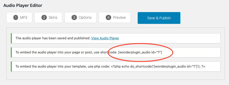 Step 4 - You can click step 4 Preview tab to preview the audio player, then click the Save & Publish button. The plugin will create the audio player and display its shortcode.