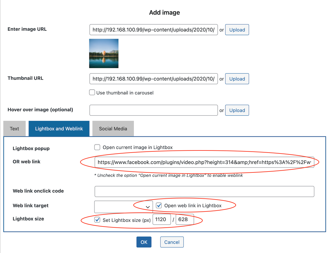 3. In the Lightbox and Weblink tab, un-check the option "Open current image in Lightbox", add the Facebook video src to the input box "OR web link". Check the option "Open web link in Lightbox" and "Set Lightbox Size". In the size input boxes, enter the width and height of the video, for Facebook videos, the size is normally 1120 by 628.