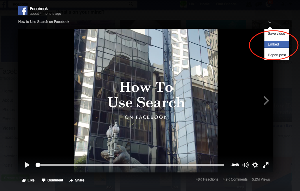 1. Click the down arrow on the top right of the Facebook video, then choose Embed from the drop down menu list.