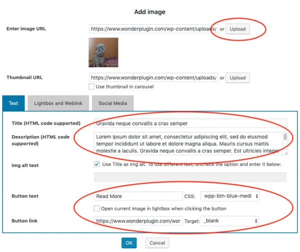 In the Add Image dialog, upload an image file or select an image file from Media Library, enter title and description for the slide. If you want to display a button, enter the button text and link.