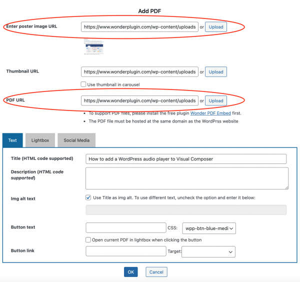 In Wonder Carousel, create a new carousel, in step 1, click the Add PDF button. In the Add PDF dialog, select an image for the "Enter poster Image URL" input box, then select a PDF file for the "PDF URL" input box.