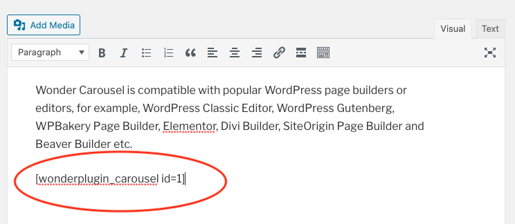 If you are using a WordPress page builder or editor, you can view the the page Wonder Carousel Help for how to add the WordPress carousel to popular WordPress page builders or editors, for example, WordPress Gutenberg, WPBakery Page Builder, Elementor, Divi Builder, SiteOrigin Page Builder and Beaver Builder etc.