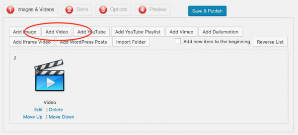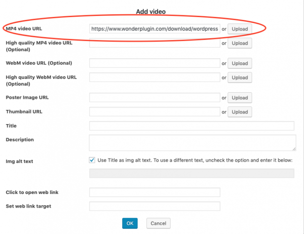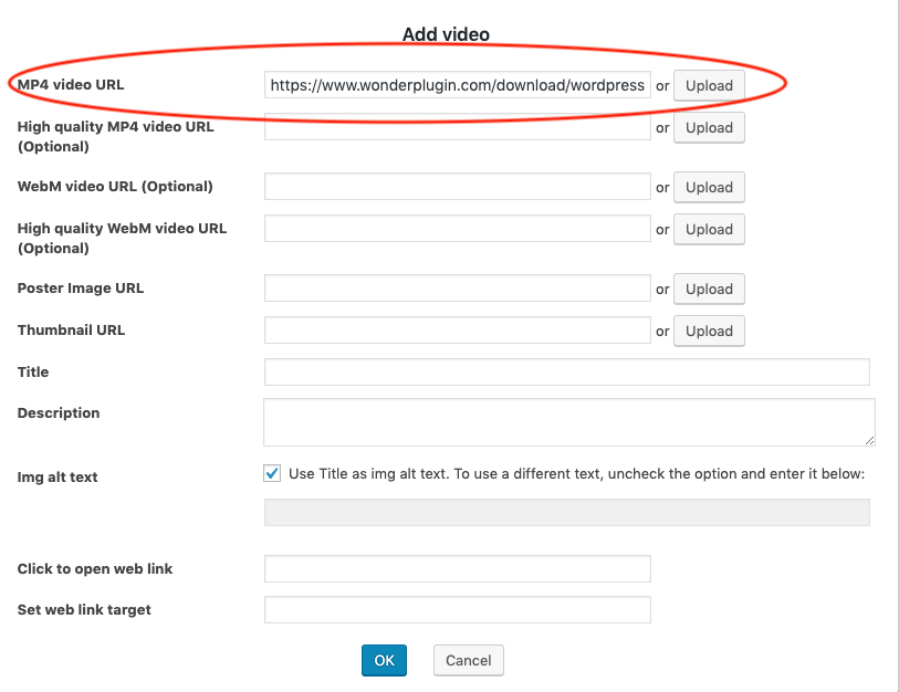 In the gallery editor, step 1, click the button Add Video. In the Add Video dialog, upload an mp4 video file or enter your mp4 video URL.