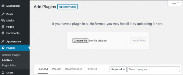 To install the plugin, in your WordPress backend, go to the left menu Plugins > Add New, click the Upload Plugin button on the top of the page, then select the downloaded plugin .zip file and install it.