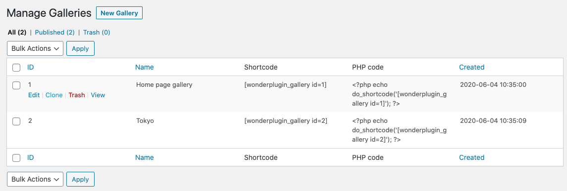 To manage all created WordPress galleries, in your WordPress backend, go to the left menu Wonder Gallery > Manage Galleries. You can delete, edit and view a gallery, you can also clone a gallery and work from it.