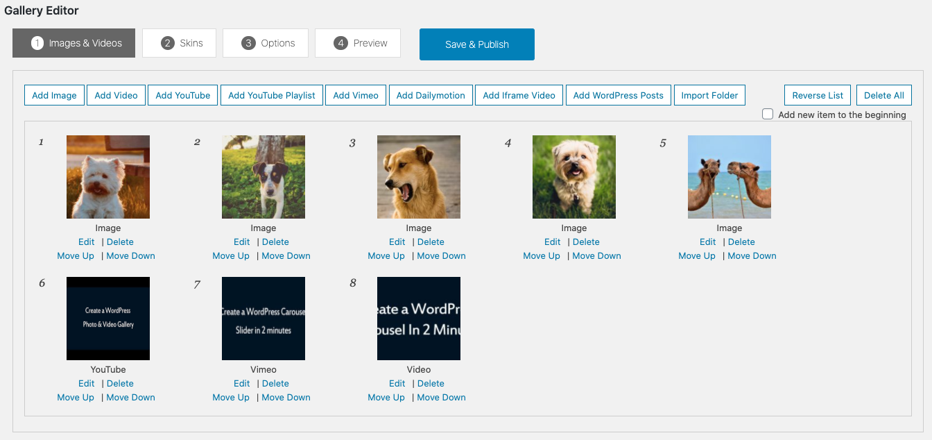 Step 2 - In the Gallery Editor, step 1 Images & Videos tab, you can add images, HTML5 videos, YouTube, Vimeo, DailyMotion and iframe videos, you can also add YouTube playlist, add WordPress posts or import the images and videos from a folder in the web server.