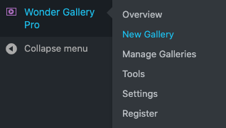 Step 1 - After you have installed the plugin, in your WordPress backend, go to the left menu, Wonder Gallery > New Gallery and create a new WordPress gallery.