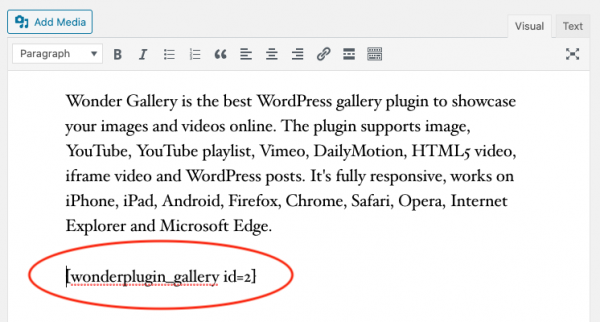 If you are using a WordPress page builder or editor, you can view the the page Wonder Gallery Help for how to add the WordPress gallery to popular WordPress page builders or editors, for example, WordPress Gutenberg, WPBakery Page Builder, Elementor, Divi Builder, SiteOrigin Page Builder and Beaver Builder etc.