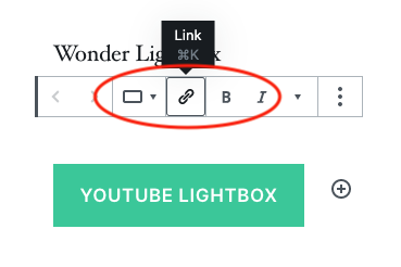 In WordPress block editor, add a Button element, then click the Link button in the top toolbar.