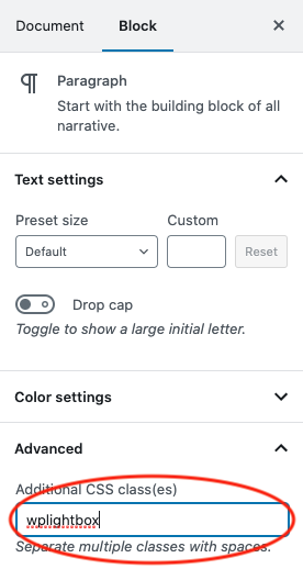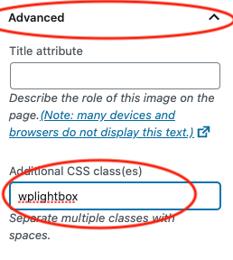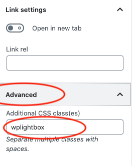 At the bottom of the right panel, click the text Advanced, then enter wplightbox to the Additional CSS class(es) input box.