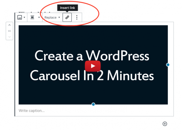 In WordPress block editor, add an image block, select an image file then click the Insert Link button in the top toolbar.