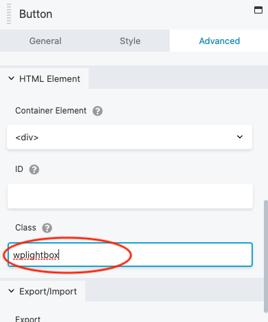 Go to the Advanced tab, HTML Element section, enter wplightbox to the Class input box.