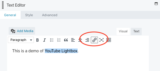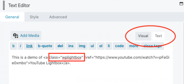 In the Text Editor, click the Text tab on the top right corner, then add class="wplightbox" to the a tag of the link.