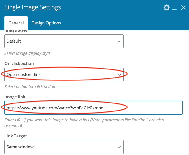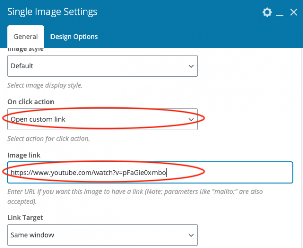 In WPBakery page builder, add a Single Image element, select an image file, then select Open Custom Link from the On click action drop down list and enter the image or video URL that you want to enable the lightbox effect to the Image link input box.