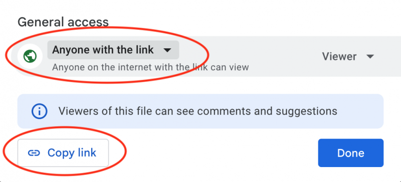 If your PDF file will be viewed by any visitors of your website, in the Share dialog, change the General Access to "Anyone with the link" then click the Copy link button.