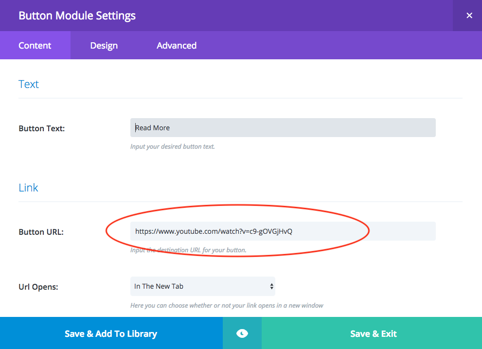 In Divi builder, add or edit a button, in the Content tab, enter the YouTube URL to the Button URL: