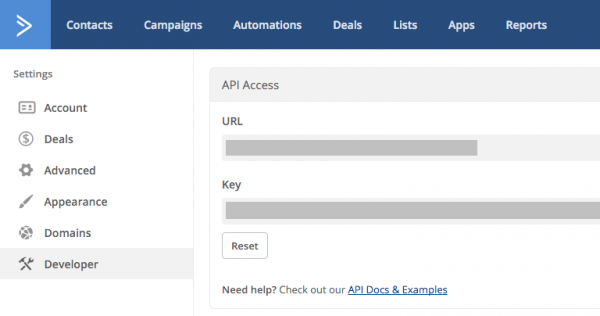 Click Developer on the left menu, then copy the API Access URL and Key.
