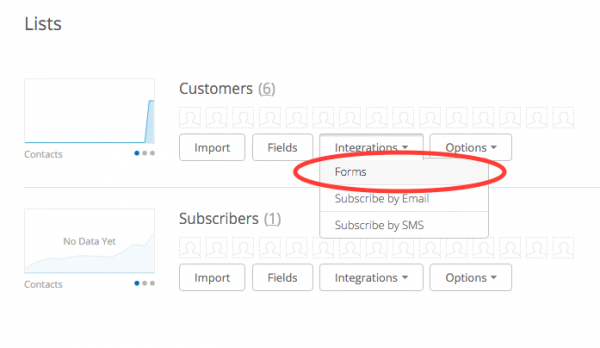 To enable double opt-in, log into your Active Campaign account, click Lists from the top menu, then click Forms from the Integrations drop-down menu, then create a new form.
