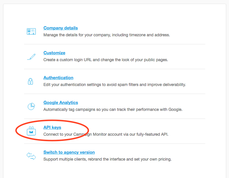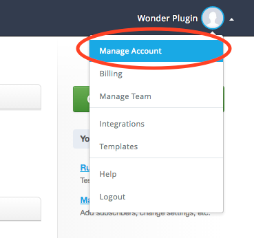 Log into your Campaign Monitor account, click your profile name on the top right corner of the page, choose Manage Account from the drop-down menu, then click the link API keys.