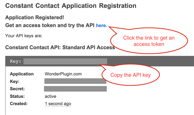 After your application is created, copy the API key and enter it to the WonderPlugin Popup plugin.