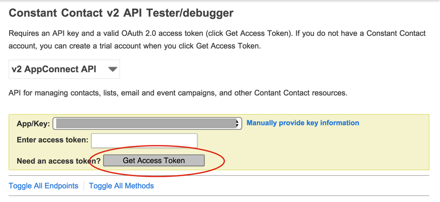 To connect to Constant Contact, you need to signup for a Constant Contact Developer account, register an application for your website, get an API key and an access token.