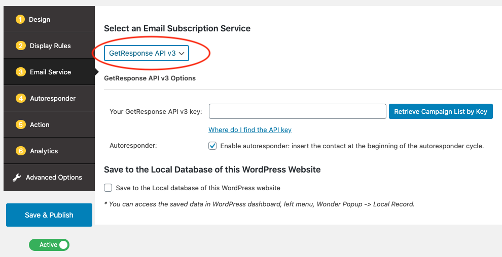In Wonder Popup, create a new popup, in the popup editor, step 3 Email Service tab, select GetResponse API v3 from the Email Subscription Service list.
