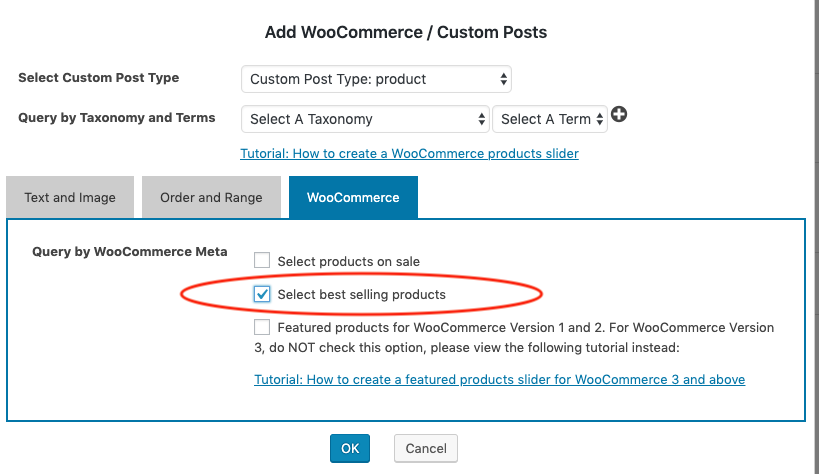 To create a WooCommerce best selling products slider, in the "Add WooCommerce / Custom Post Type" dialog, WooCommerce tab, check the option "Select best selling products".