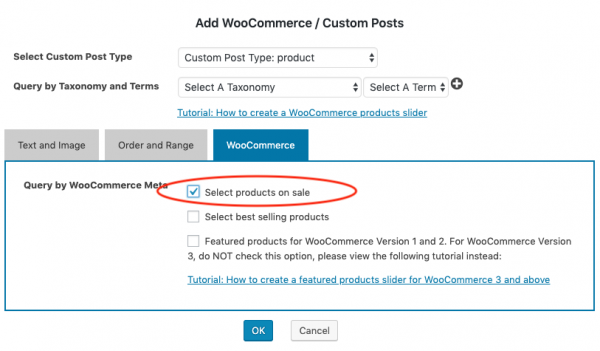 To create a WooCommerce on sale products slider, in the "Add WooCommerce / Custom Post Type" dialog, WooCommerce tab, check the option "Select products on sale".