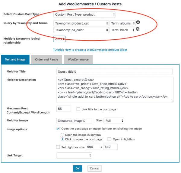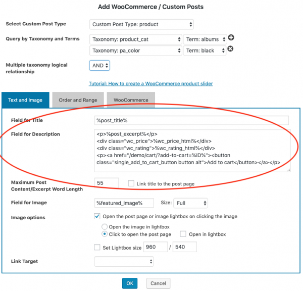In the "Add WooCommerce / Custom Post Type" dialog, enter the following text to the "Field for Title" input box. It will use the product name as the title of the slide.