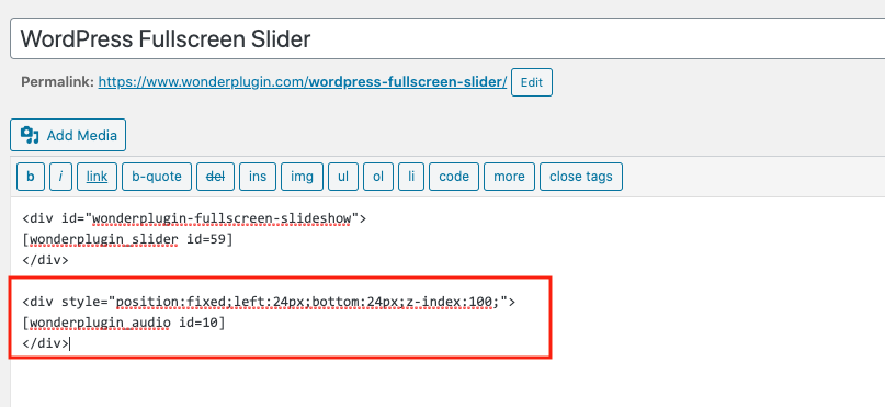To add the full screen slider to a WordPress page or post, in the page or post editor, switch to Text mode, enter the following HTML code to the beginning of the page:
