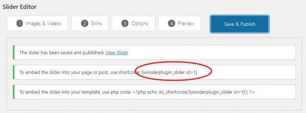 After you create a WordPress slider, the plugin will provide the slider shortcode.