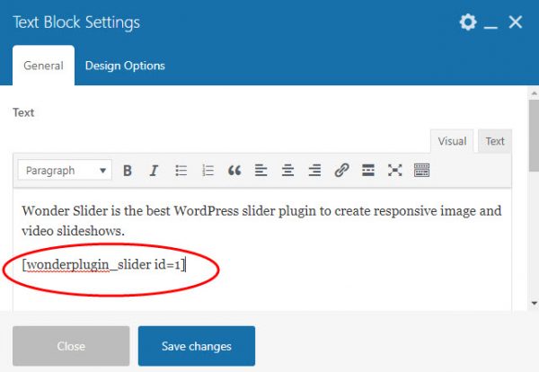 To add the slider shortcode, in WPBakery Page Builder, add a Text Block element.